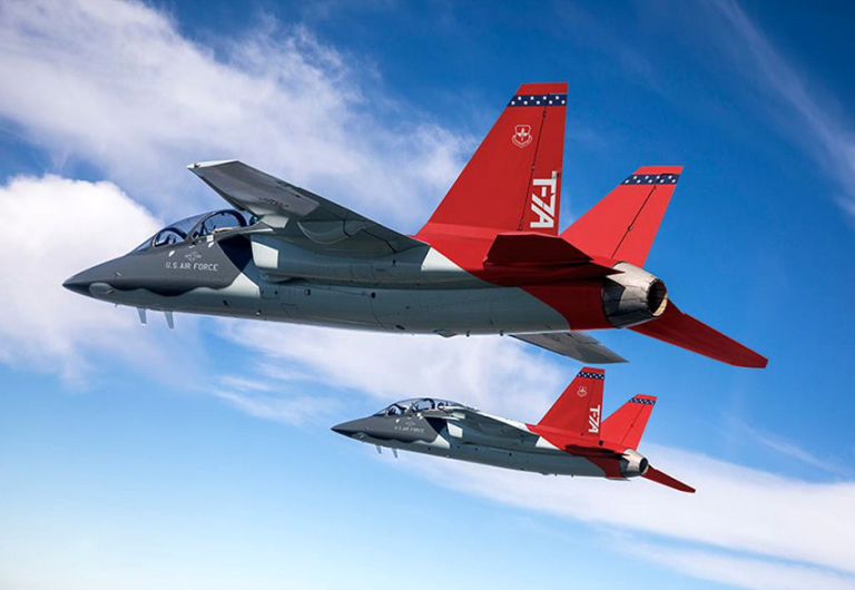 The T-7A trainer, set to enter service in 2023, will better train future fighter pilots for flying fifth-generation fighters such as the F-22 and F-35 than the 1960s-era T-38 Talon it replaces. The T-7A will fly with red painted tails.